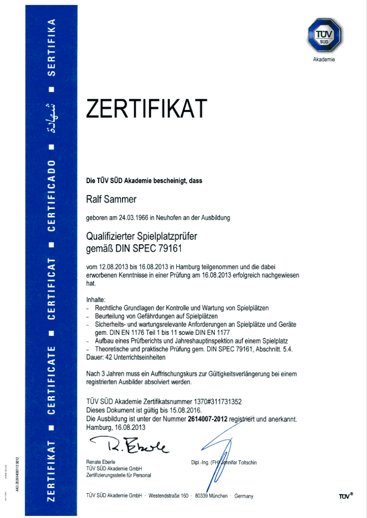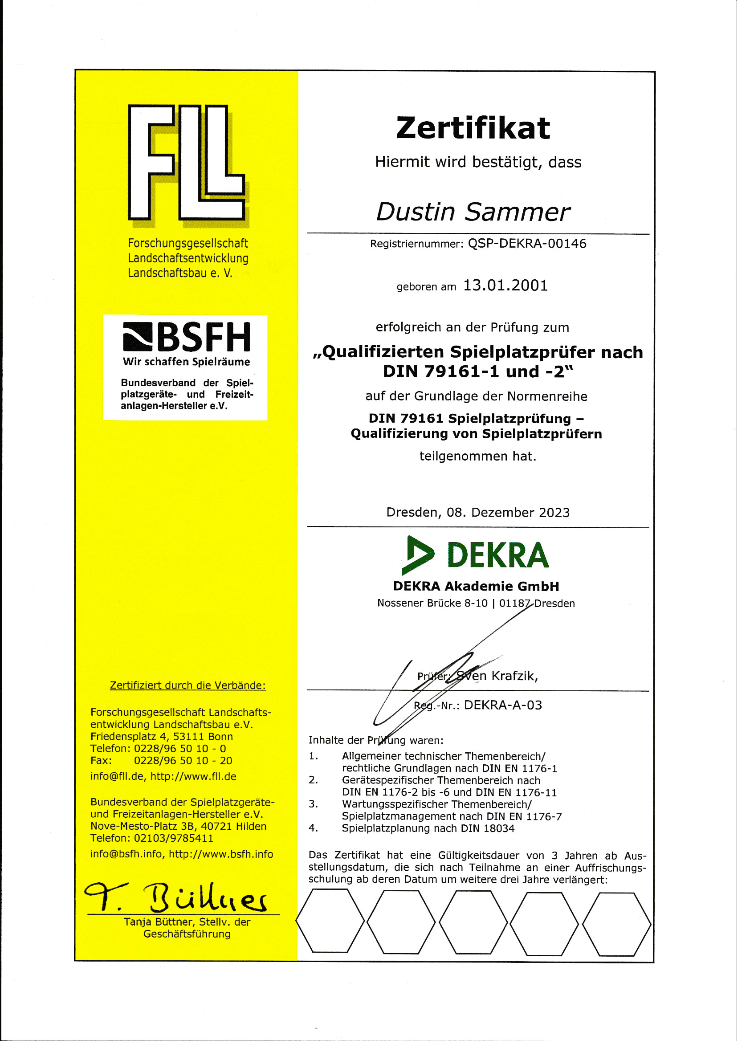Sichere Spielplätze sind Vertrauenssache. Als zertifizierte Prüfer nach DIN EN 1176 prüfen, warten und inspizieren wir Spielplätze in Kommunen, Wohnanlagen und sämtlichen Einrichtungen – für maximale Sicherheit der Kinder. Wir übernehmen die gesetzlich vorgeschriebenen Kontrollen und dokumentieren alles transparent und komplett nachvollziehbar für Sie.